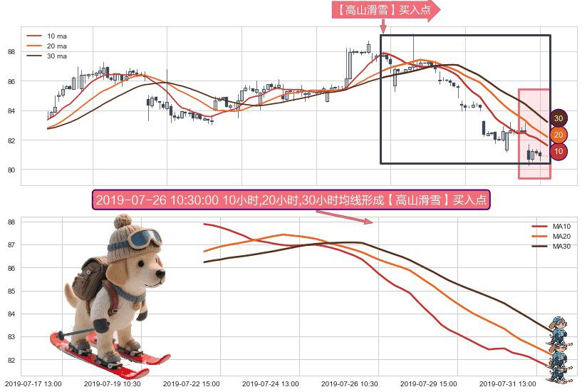⚀ 2019-07-22 13:00:00小时-2019-07-31 15:00:00小时显现 10小时-20小时-30小时均线 【高山滑雪】买入点 看多信号,后市看涨,买入