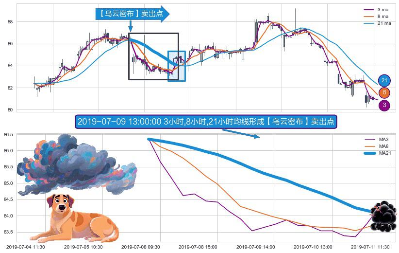 ⚀ 2019-07-05 15:00:00小时-2019-07-11 10:30:00小时显现 3小时-8小时-21小时均线 【乌云密布】卖出点 看空信号,后市看跌,卖出