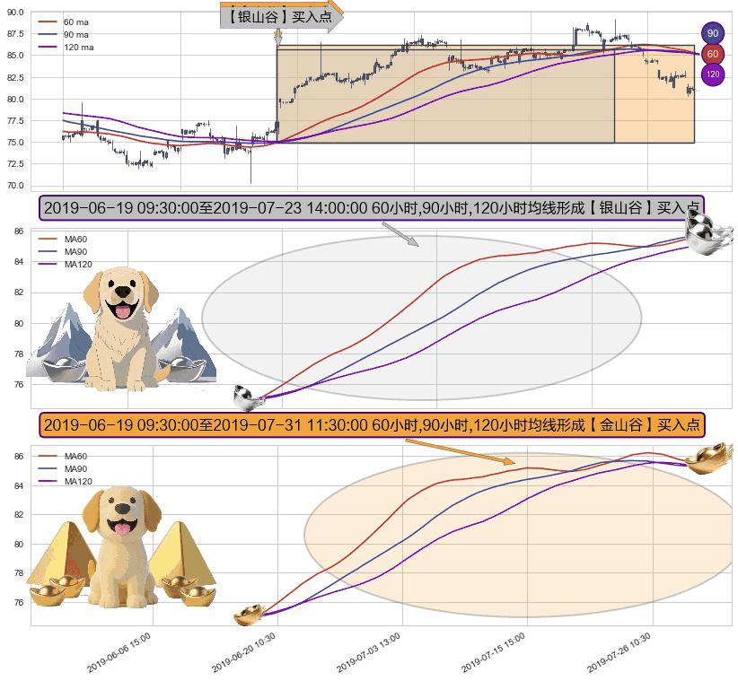 ⚃ 2019-06-19 10:30:00-小时至2019-07-31 11:30:00-小时显现 60小时-90小时-120小时均线 【金山谷】买入点 其再次确认了买入信号,可靠性更强,买入