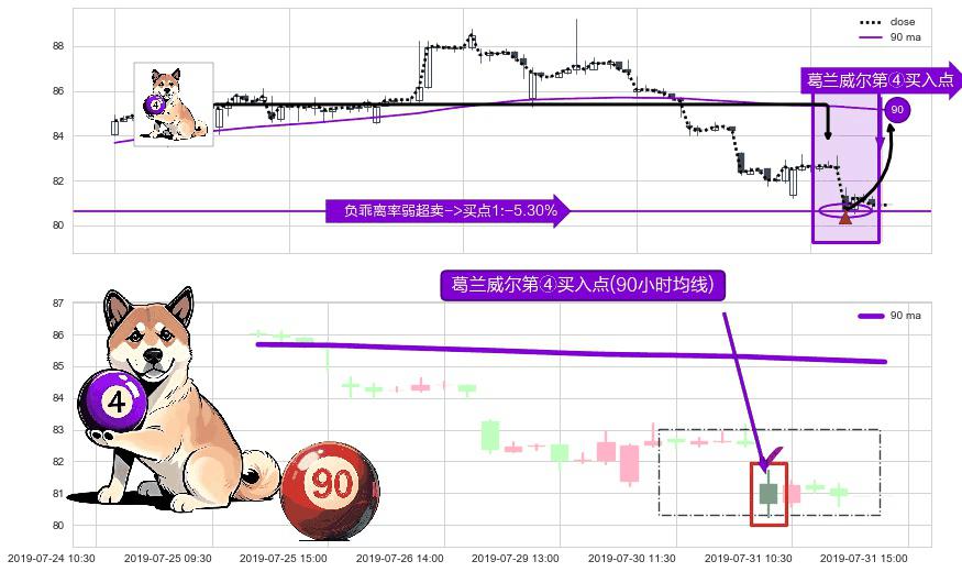 ⚀ 2019-07-31 09:30:00-小时显现 葛兰威尔均线 90小时均线 第④买入点 下降趋势均值回复的短线反弹信号,后市看涨,买进信号