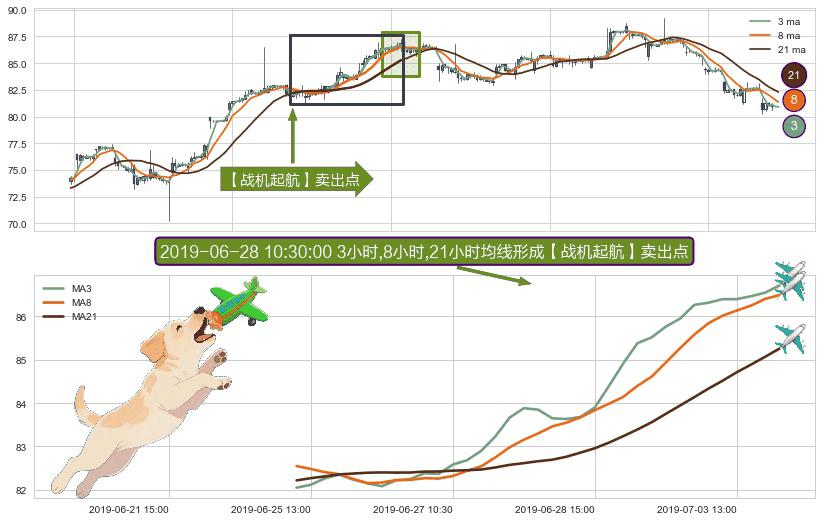 ⚀ 2019-06-25 11:30:00小时-2019-07-04 09:30:00小时显现 3小时-8小时-21小时均线 【战机起航】卖出点 看空信号,后市看跌,卖出