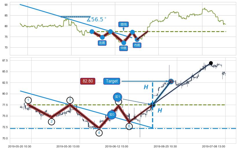 从2019-06-13 09:30至2019-07-04 09:30,共包含85个小时,阶段股价上涨16.73%,阶段股价变动位移路程比: 1 : 2.0