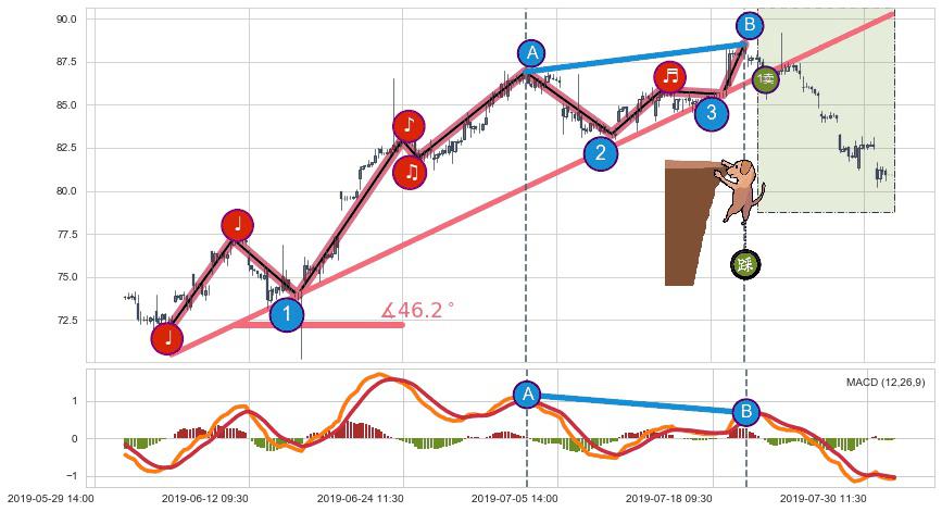 ➢ 最后的上涨趋势2019-06-04 15:00至2019-07-26 09:30:存在破位迹象,后续小调整或者反转下跌