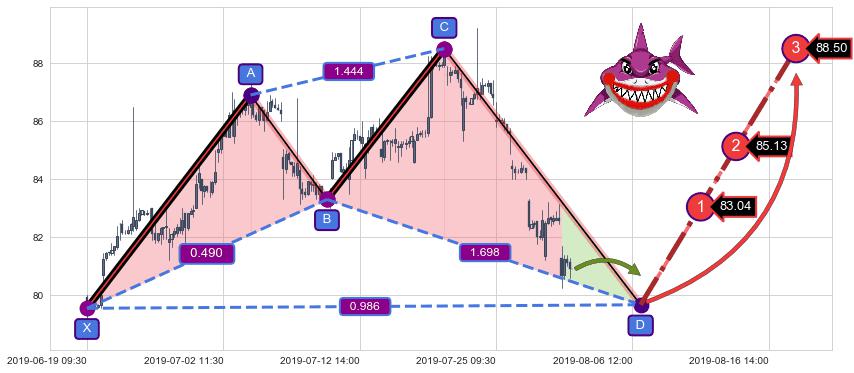➢ 接近预测D点位置, 随时警戒看涨【鲨鱼】形态反转启动