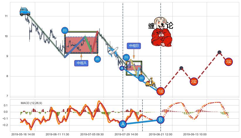 ➢ 【中枢B】:07-23:09-07-30:10,中枢由4笔构成,共32交易小时, ZG=8.42, ZD=8.40
