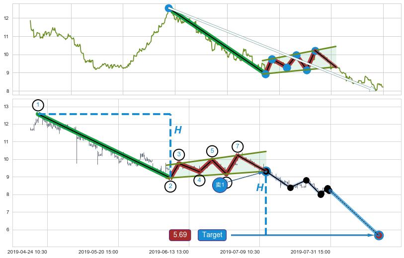 | 4 🅚:徐缓下降 ➕ 📐:升旗形下行突破支撑位破位, 猜想持续下沉下跌,被突破的支撑位已变为阻力位 ☞ 看空信号 ⇥ 【🅚线】交织【图形】⇥ 综合量化分数: 42 | > |