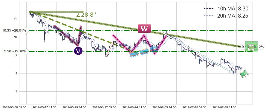 从2019-05-07 09:30至2019-07-30 09:30,共包含343个小时,阶段股价下跌-28.56%,阶段股价变动位移路程比: 1 : 8,下跌趋势角度: 28.8
