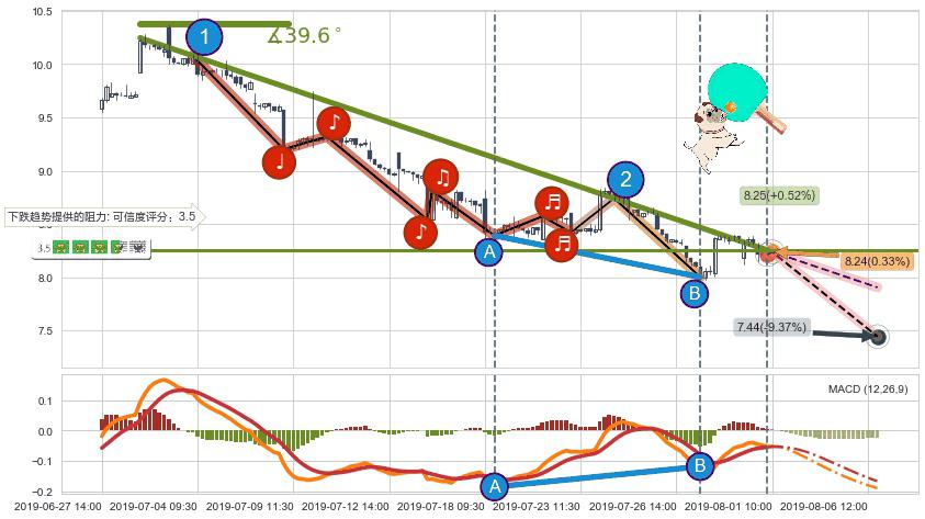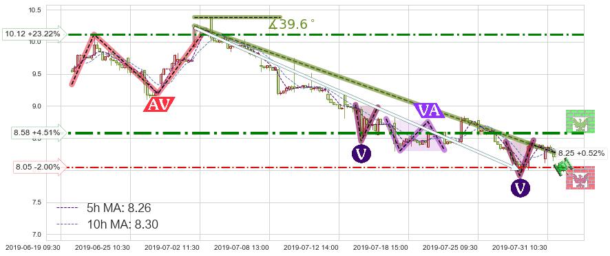 🦴 长线均值回复组合短线趋势跟踪[强阻力信号]2019-07-02 09:30-2019-07-30 09:30下跌趋势依然成立(下跌趋势跟踪依然存在),短线价格略微上行反弹(均值回复猜想),即将接近下跌趋势提供的未破位阻力价格:8.25。