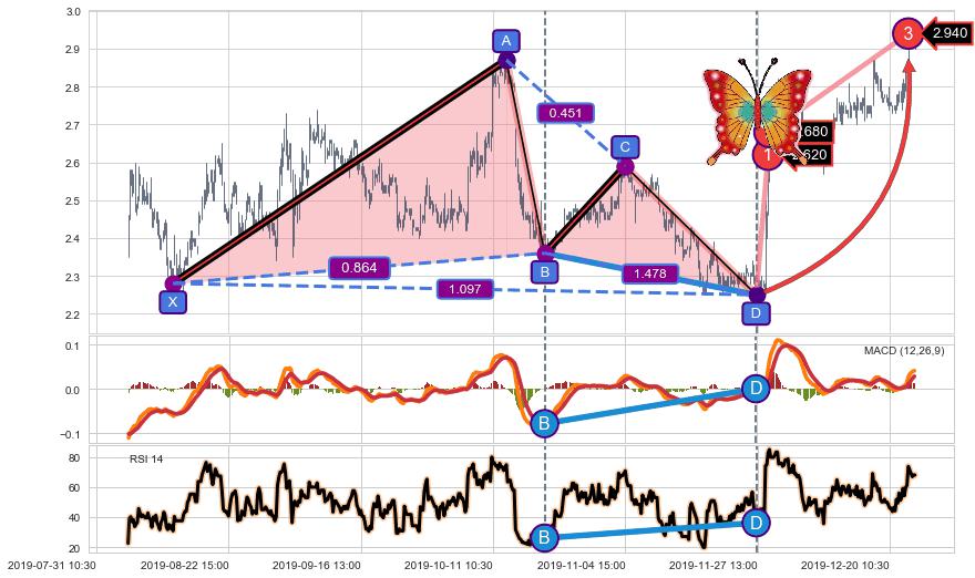 ➣ 已完成【蝴蝶】形态起点X: 08-13:15, 终点D: 11-27:11, 共442交易小时