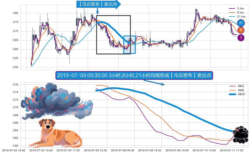 ⚀ 2019-07-04 15:00:00小时-2019-07-11 10:30:00小时显现 3小时-8小时-21小时均线 【乌云密布】卖出点 看空信号,后市看跌,卖出