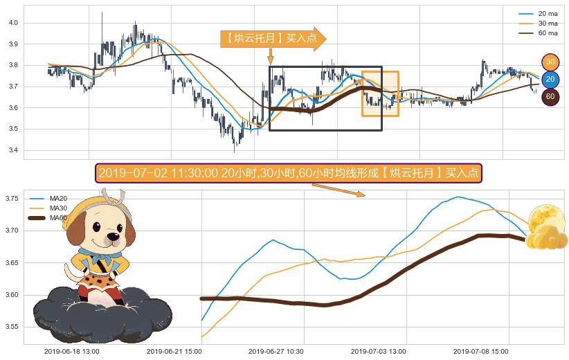 ⚀ 2019-06-21 15:00:00小时-2019-07-09 15:00:00小时显现 20小时-30小时-60小时均线 【烘云托月】买入点 看多信号,后市看涨,买入