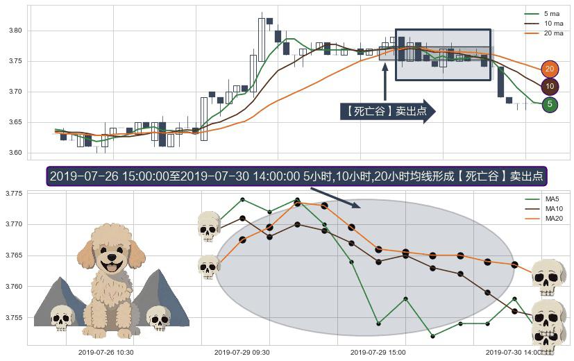 ⚀ 2019-07-29 09:30:00-小时至2019-07-30 14:00:00-小时显现 5小时-10小时-20小时均线 【死亡谷】卖出点 看空信号,后市看跌,卖出