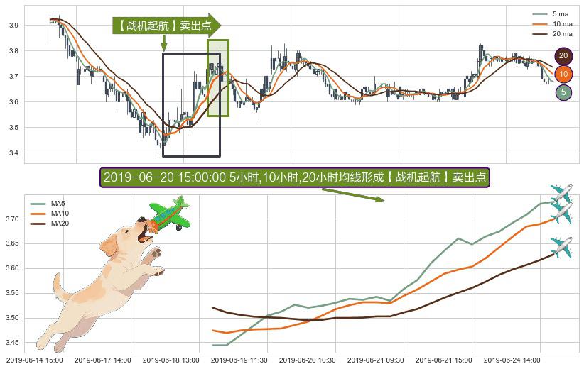 ⚀ 2019-06-18 14:00:00小时-2019-06-24 15:00:00小时显现 5小时-10小时-20小时均线 【战机起航】卖出点 看空信号,后市看跌,卖出