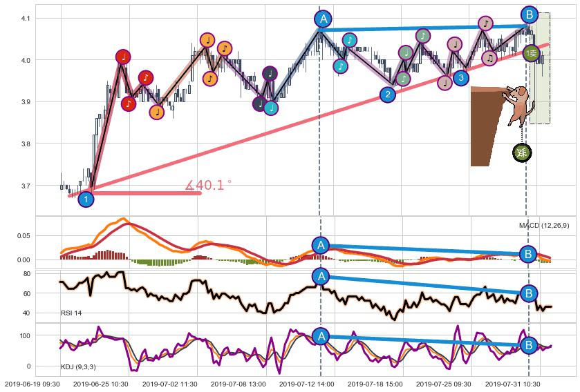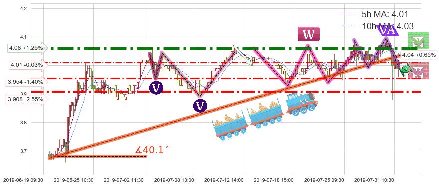 ✂️ 2019-06-19 13:00-2019-07-31 10:30上升趋势存在反转[风险],虽然原上升趋势的支撑位(4.04)已破位,但其支撑效果尚存,原上升趋势角度: 40.1˚
