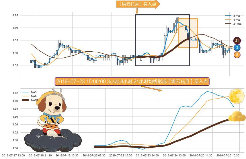 形态多维评估: ⚀ 2019-07-19 14:00:00小时-2019-07-26 09:30:00小时显现 3小时-8小时-21小时均线 【烘云托月】买入点 看多信号,后市看涨,买入