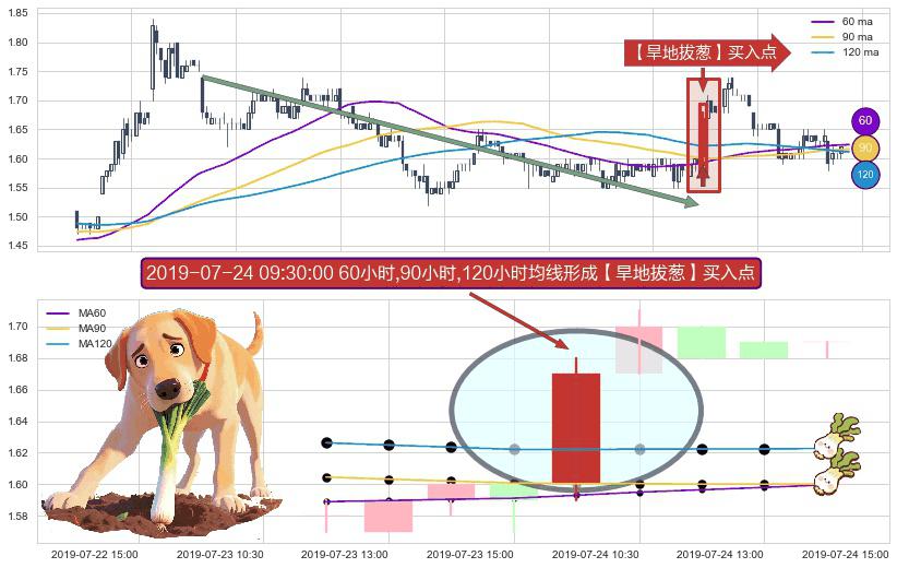 形态多维评估: ⚀ 2019-07-24 09:30:00小时显现 60小时-90小时-120小时均线 【旱地拔葱】买入点 看多信号,后市看涨,买入