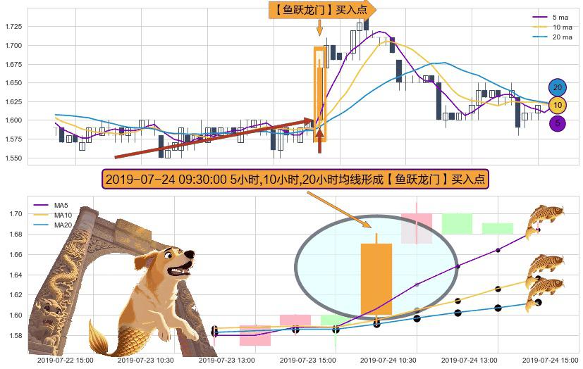 形态多维评估: ⚀ 2019-07-24 09:30:00小时显现 5小时-10小时-20小时均线 【鱼跃龙门】买入点 看多信号,后市看涨,买入