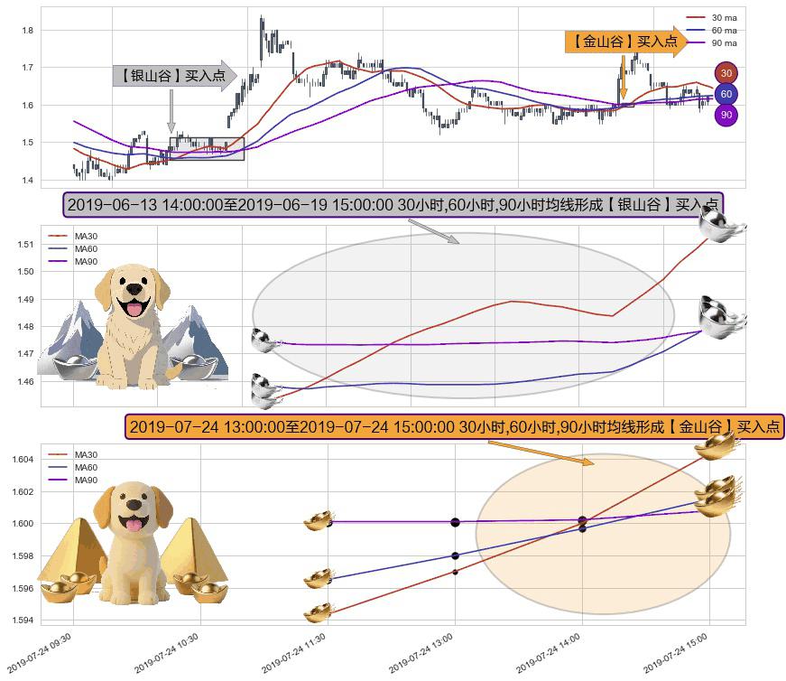 ⚃ 2019-07-24 14:00:00-小时至2019-07-24 15:00:00-小时显现 30小时-60小时-90小时均线 【金山谷】买入点 其再次确认了买入信号,可靠性更强,买入