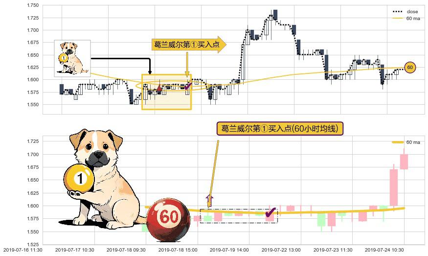 形态多维评估: ⚀ 2019-07-19 09:30:00-小时显现 葛兰威尔均线 60小时均线 第买①入点 走势反转见底信号,后市看涨,买进信号