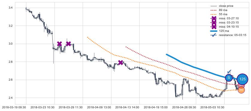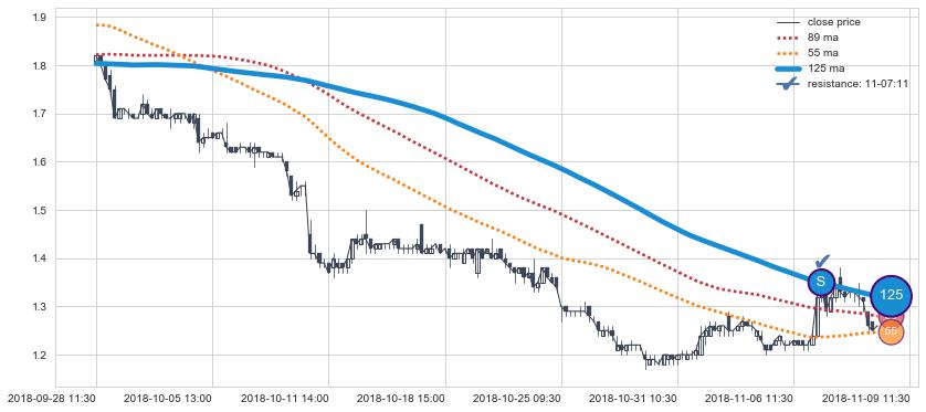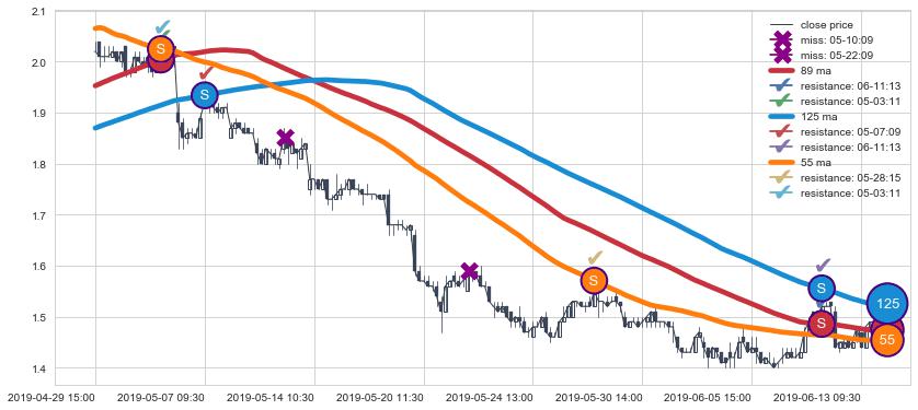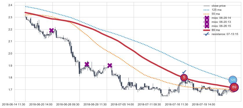 下跌趋势04-29 15:00-06-13 11:30,均线89, 125, 55确认关键阻力4处