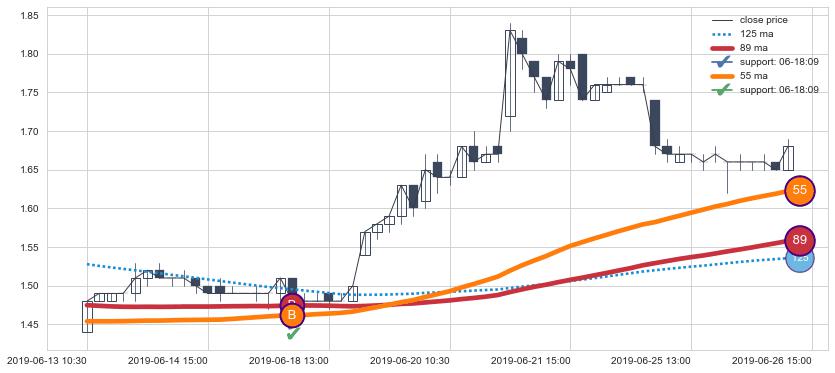 上涨趋势06-13 10:30-06-26 15:00,均线89, 55确认关键支撑1处