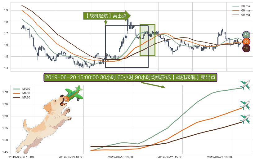 形态多维评估: ⚀ 2019-06-13 14:00:00小时-2019-06-27 15:00:00小时显现 30小时-60小时-90小时均线 【战机起航】卖出点 看空信号,后市看跌,卖出