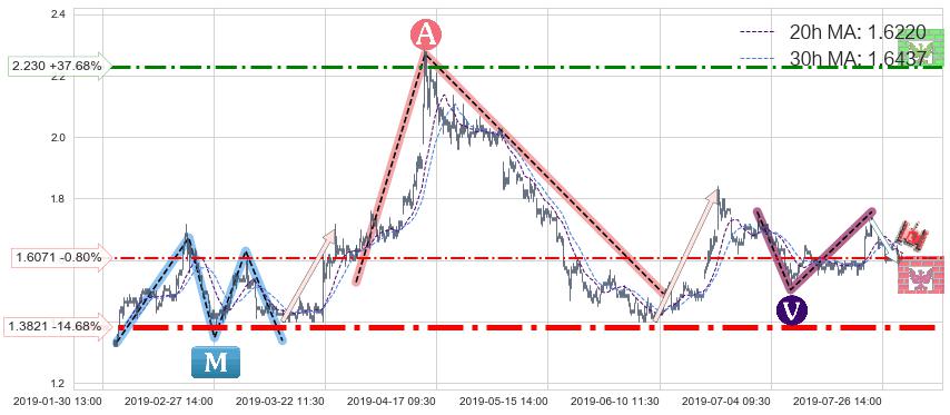 ♘ 阻力价格位2.230,可信任强度56.32%,距离最后交易2019-07-31 15:00形成的收盘价格1.6200相差 +37.68%