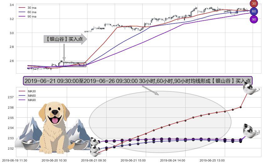 形态多维评估: ⚀ 2019-06-21 10:30:00-小时至2019-06-26 09:30:00-小时显现 30小时-60小时-90小时均线 【银山谷】买入点 看多信号,后市看涨,买入