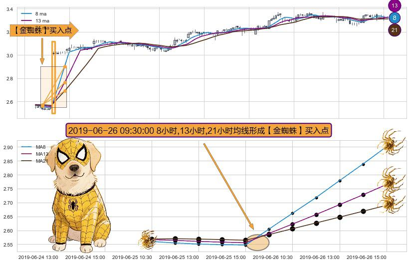 形态多维评估: ⚀ 2019-06-26 09:30:00小时显现 8小时-13小时-21小时均线 【金蜘蛛】买入点 看多信号,后市看涨,买入