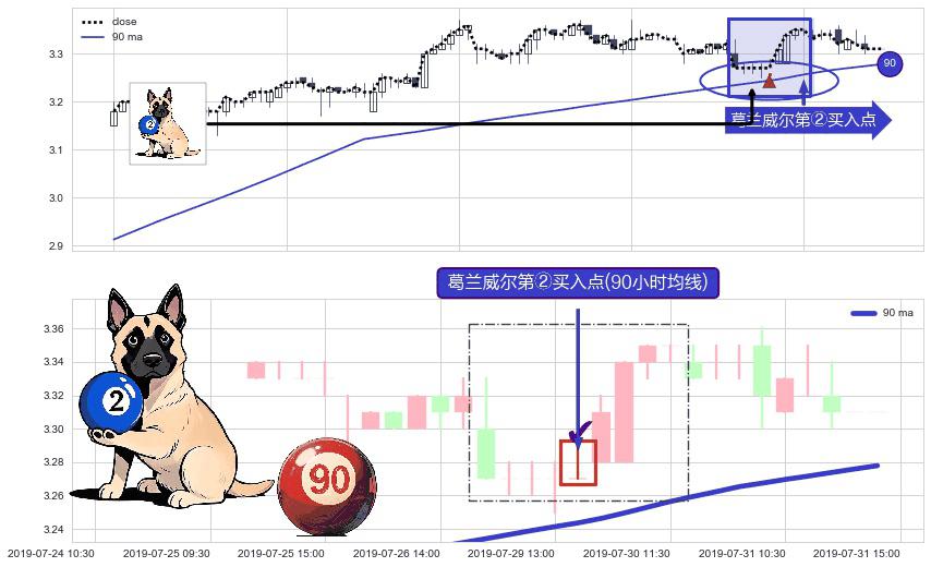 形态多维评估: ⚀ 2019-07-29 14:00:00-小时显现 葛兰威尔均线 90小时均线 第②买入点 上升趋势的中继信号,后市看涨,买进信号
