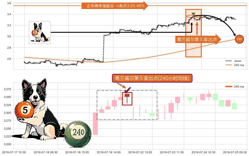 形态多维评估: ⚀ 2019-07-19 15:00:00-小时显现 葛兰威尔均线 240小时均线 第⑤卖出点 上升趋势均值回复的短线回落信号,后市看跌,卖出信号