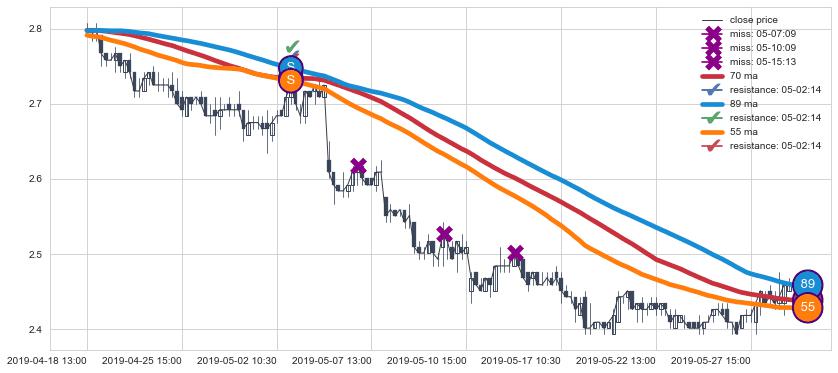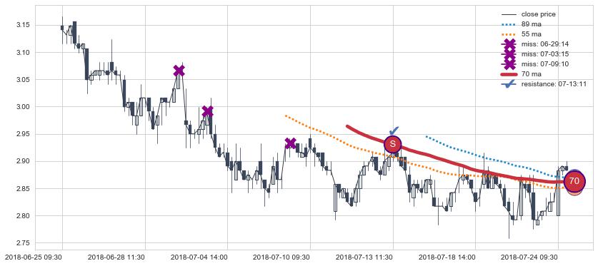 下跌趋势04-18 13:00-05-29 11:30,均线89, 70, 55确认关键阻力1处
