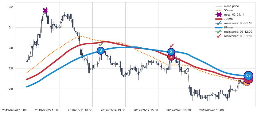 下跌趋势02-28 13:00-04-01 13:00,均线89, 70确认关键阻力2处