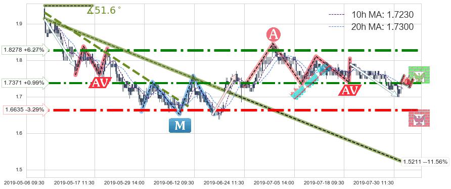 ♘ 阻力价格位1.7371,可信任强度71.59%,距离最后交易2019-07-31 15:00形成的收盘价格1.7200相差 +0.99%