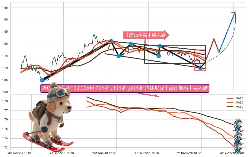 从2019-06-21 15:00至2019-07-09 09:30,共包含62个小时,阶段股价上涨1.60%,阶段股价变动位移路程比: 1 : 14