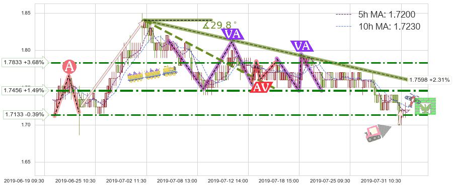 ♘ 阻力价格位1.7833,可信任强度65.82%,距离最后交易2019-07-31 15:00形成的收盘价格1.7200相差 +3.68%