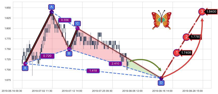 ➣ 未完成【蝴蝶】形态起点X: 06-19:15, 已到达C点: 07-11:11, 预测最终D点: 08-13:13, 共222交易小时