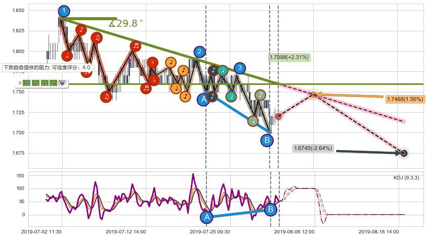 ➢ 预测:2019-08-06 12:00,【小幅反弹】稳定目前下跌趋势的前提下,预测价格:1.7468