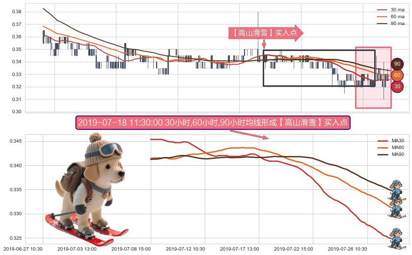 形态多维评估: ⚀ 2019-07-08 15:00:00小时-2019-07-29 14:00:00小时显现 30小时-60小时-90小时均线 【高山滑雪】买入点 看多信号,后市看涨,买入