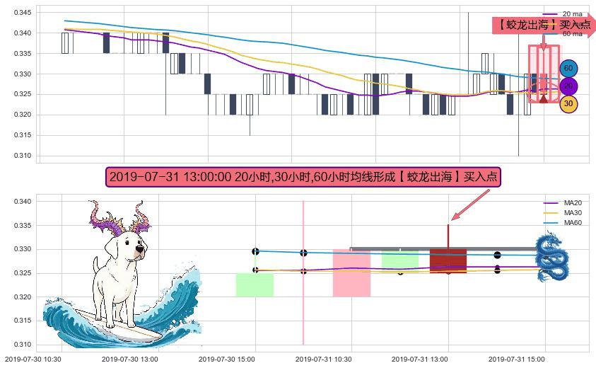 形态多维评估: ⚀ 2019-07-31 13:00:00小时显现 20小时-30小时-60小时均线 【蛟龙出海】买入点 看多信号,后市看涨,买入