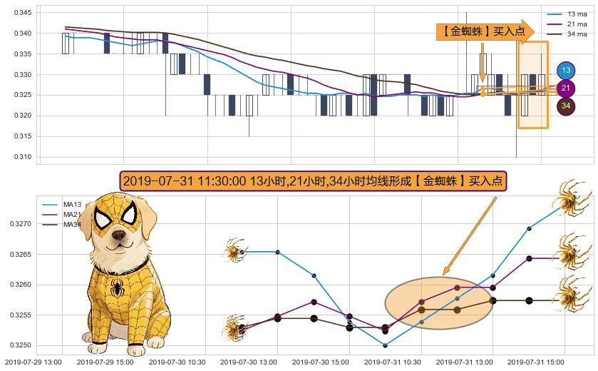 形态多维评估: ⚀ 2019-07-31 11:30:00小时显现 13小时-21小时-34小时均线 【金蜘蛛】买入点 看多信号,后市看涨,买入
