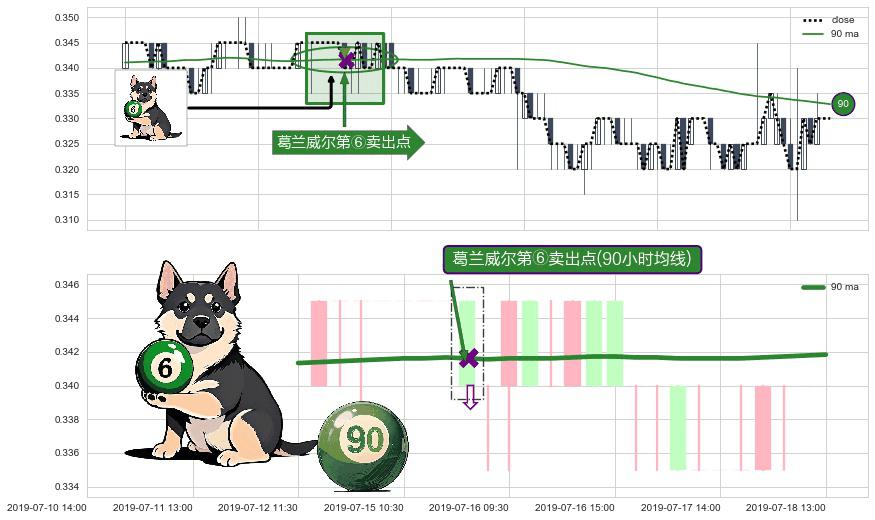 形态多维评估: ⚀ 2019-07-15 14:00:00-小时显现 葛兰威尔均线 90小时均线 第⑥卖出点 走势反转见顶信号,后市看跌,卖出信号