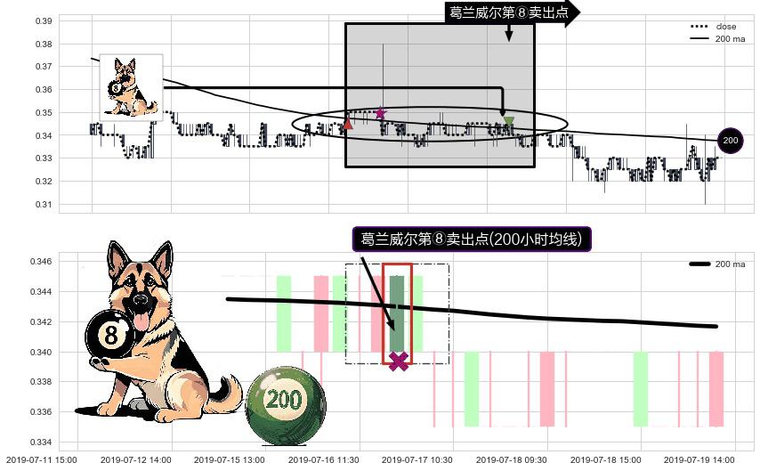 形态多维评估: ⚀ 2019-07-16 14:00:00-小时显现 葛兰威尔均线 200小时均线 第⑧卖出点 下降趋势的中继信号,后市看跌,卖出信号