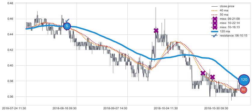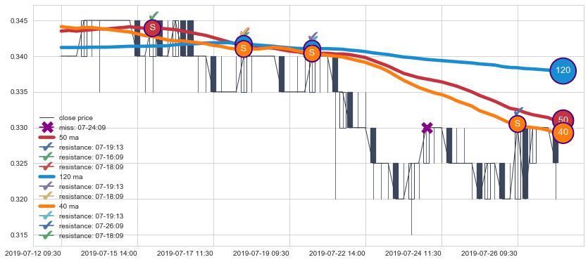下跌趋势07-12 09:30-07-26 15:00,均线120, 50, 40确认关键阻力4处
