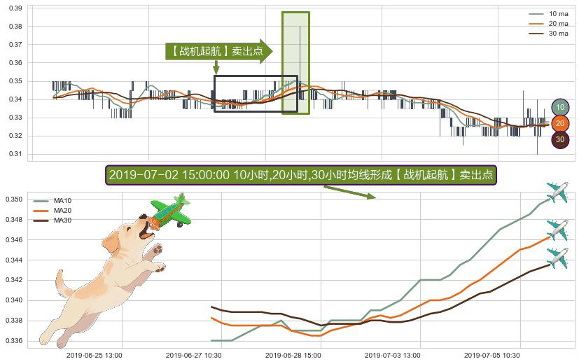 形态多维评估: ⚀ 2019-06-27 09:30:00小时-2019-07-05 14:00:00小时显现 10小时-20小时-30小时均线 【战机起航】卖出点 看空信号,后市看跌,卖出