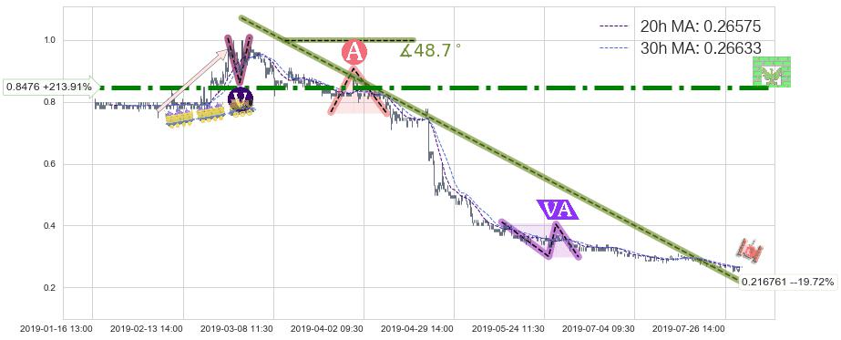 ♘ 在最后的下跌阶段2019-02-28 13:00至2019-07-31 15:00,存在 破位边缘的阻力位 ,阻力价格0.216761,可信任强度82.98%,其距离最后价格0.27000相差 -19.72%