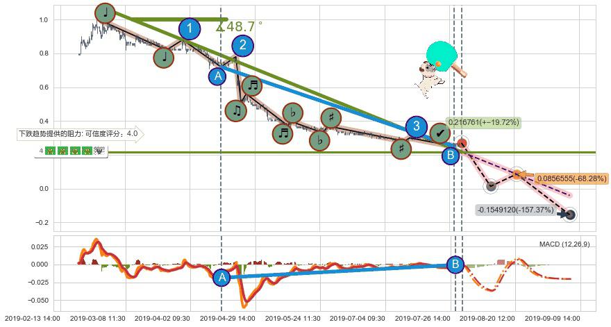 ➣ 预测:2019-08-21 10:00,【试探阻力】稳定目前下跌趋势的前提下,预测价格:0.0856555