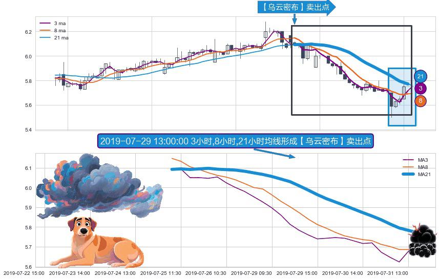 形态多维评估: ⚀ 2019-07-25 10:30:00小时-2019-07-31 14:00:00小时显现 3小时-8小时-21小时均线 【乌云密布】卖出点 看空信号,后市看跌,卖出