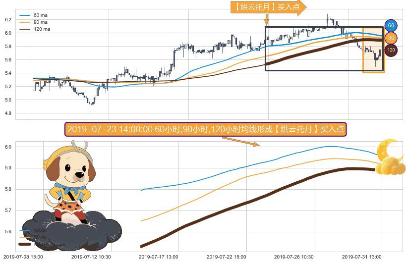 形态多维评估: ⚀ 2019-07-15 14:00:00小时-2019-07-31 14:00:00小时显现 60小时-90小时-120小时均线 【烘云托月】买入点 看多信号,后市看涨,买入