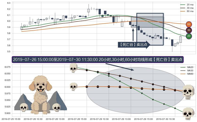 形态多维评估: ⚀ 2019-07-29 09:30:00-小时至2019-07-30 11:30:00-小时显现 20小时-30小时-60小时均线 【死亡谷】卖出点 看空信号,后市看跌,卖出